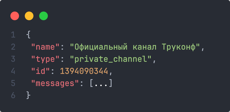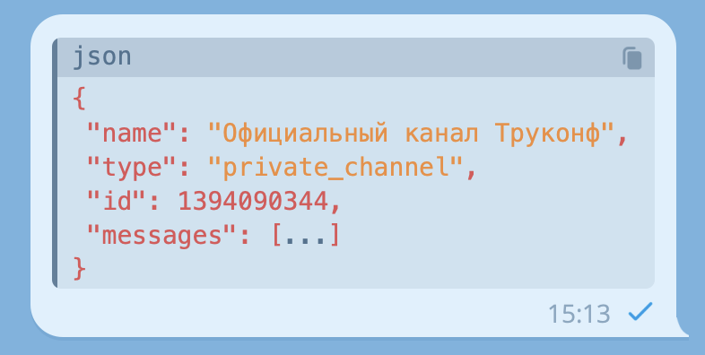 Это мега-фича, которая «решит все твои проблемы». Потому что нам не надо будет придумывать велосипед, продумывать логику парсинга чата, выгрузки всех мемчиков, аудиосообщений и подобного. Команда Telegram все сделала за нас – для нас.