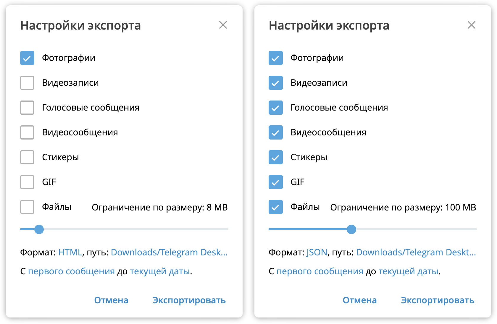 Я люблю Telegram за их стремление быть современными. Они действительно стараются быть user-friendly. Официально Telegram поддерживает все существующие платформы. В Telegram Desktop (не путать с Telegram for macOS) из коробки доступен экспорт любого чата.