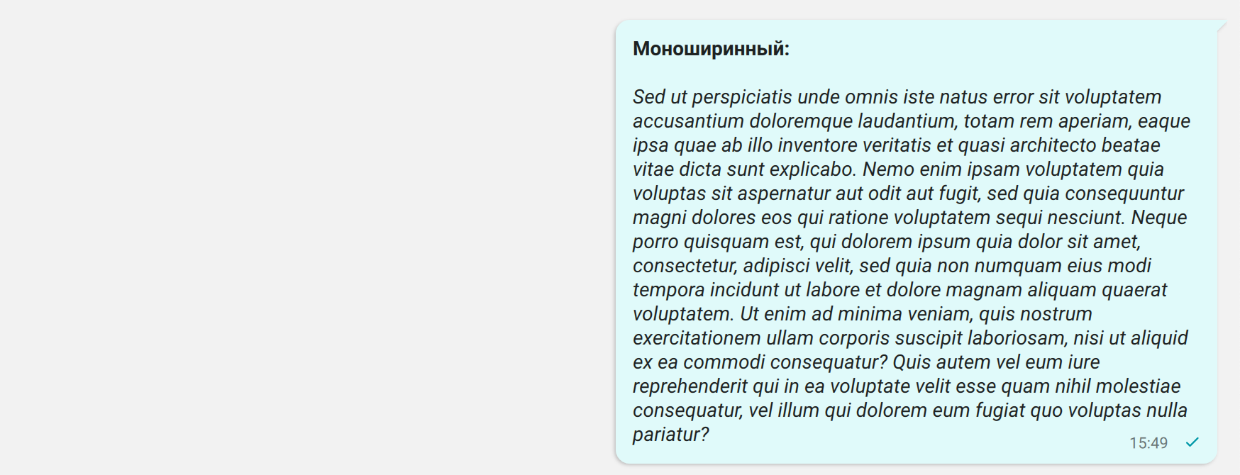 "text_entities": [ { "type": "bold", "text": "Полужирный текст" }, { "type": "plain", "text": "\n" }, { "type": "italic", "text": "Курсив" }, { "type": "plain", "text": "\n" }, { "type": "strikethrough", "text": "Подчёркнутый" }, { "type": "plain", "text": "\n" }, { "type": "underline", "text": "Зачёркнутый" }, { "type": "plain", "text": "\n" }, { "type": "code", "text": "Моноширинный (inline code)" }, { "type": "plain", "text": " \n" }, { "type": "pre", "text": "Моноширинный ", "language": "" }, { "type": "plain", "text": "\n\n" }, { "type": "text_link", "text": "Ссылка", "href": "https://trueconf.ru/" }, { "type": "plain", "text": "\n\n" }, { "type": "link", "text": "https://trueconf.ru" }, { "type": "plain", "text": "\n\n" }, { "type": "spoiler", "text": "Скрытый текст" }, { "type": "plain", "text": "\n\n" }, { "type": "blockquote", "text": "Цитата", "collapsed": false }, { "type": "plain", "text": "\n\n" }, { "type": "blockquote", "text": "Длинная цитата \n\nLorem Ipsum is simply dummy text of the printing and typesetting industry. Lorem Ipsum has been the industry's standard dummy text ever since the 1500s, when an unknown printer took a galley of type and scrambled it to make a type specimen book. It has survived not only five centuries, but also the leap into electronic typesetting, remaining essentially unchanged. It was popularised in the 1960s with the release of Letraset sheets containing Lorem Ipsum passages, and more recently with desktop publishing software like Aldus PageMaker including versions of Lorem Ipsum.", "collapsed": true }, { "type": "plain", "text": "\n\n" }, { "type": "pre", "text": "# Моноширинный python", "language": "python" }, { "type": "plain", "text": "" } ] |