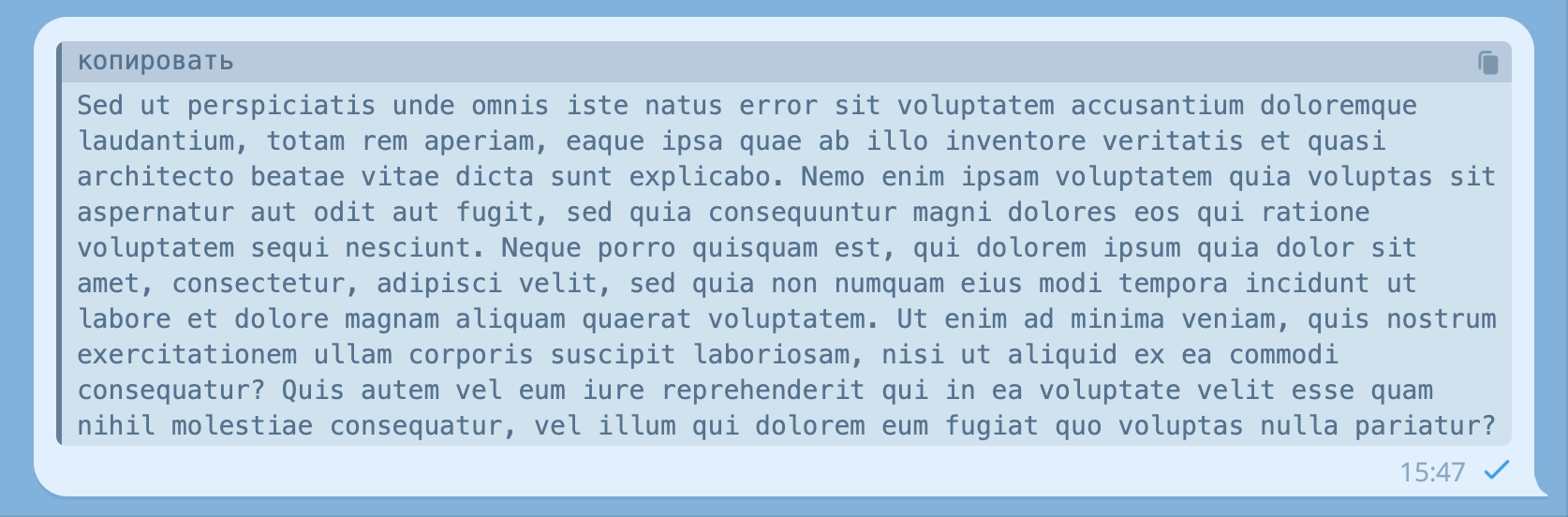 По моему скромному мнению Telegram самый богатый мессенджер в плане разновидности форматирования. Тут тебе и цитаты, и сворачивающиеся цитаты, моноширинный текст и автоматическое распознавание кода, спойлеры. К сожалению не все это поддерживают (привет, WhatsApp и VK Messenger), в том числе и Труконф.