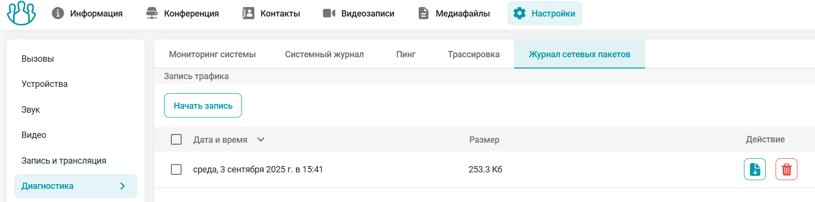 Для корректности сбора логов трафика запись необходимо начинать до звонка, а останавливать уже после разъединения. Скачайте запись, нажав на кнопку справа от нужного файла.