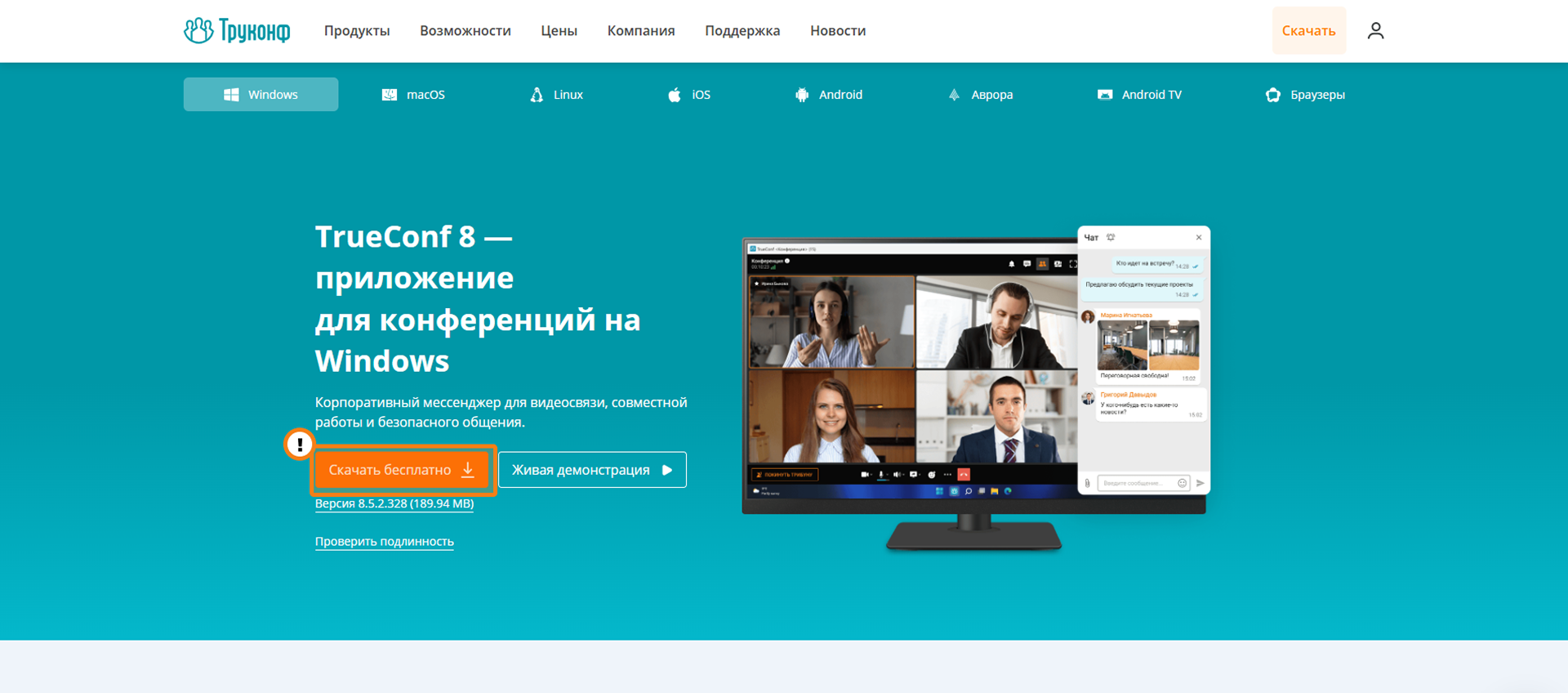 - Перейдите на сайт для скачивания десктопного приложения Труконф.