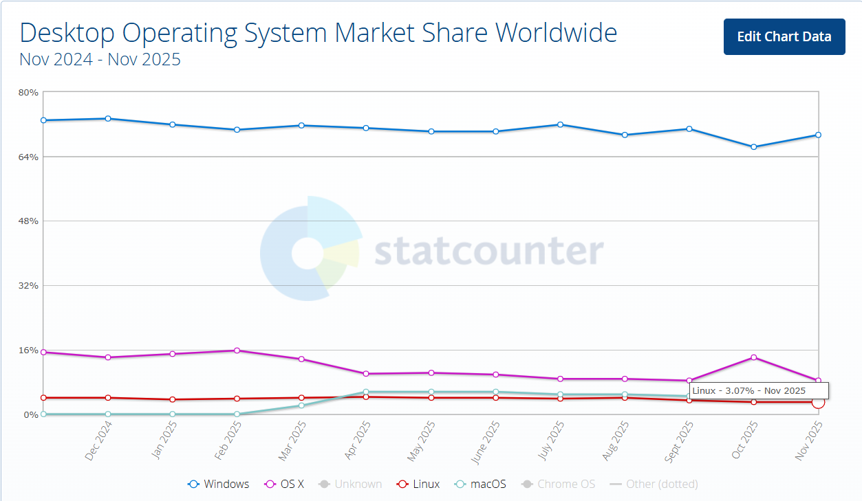 Стоит отметить, что не все пользователи настольных ПК эксплуатируют ОС Windows и по состоянию на декабрь 2025 есть некоторое количество ПК с ОС Linux (в сумме около 3%).