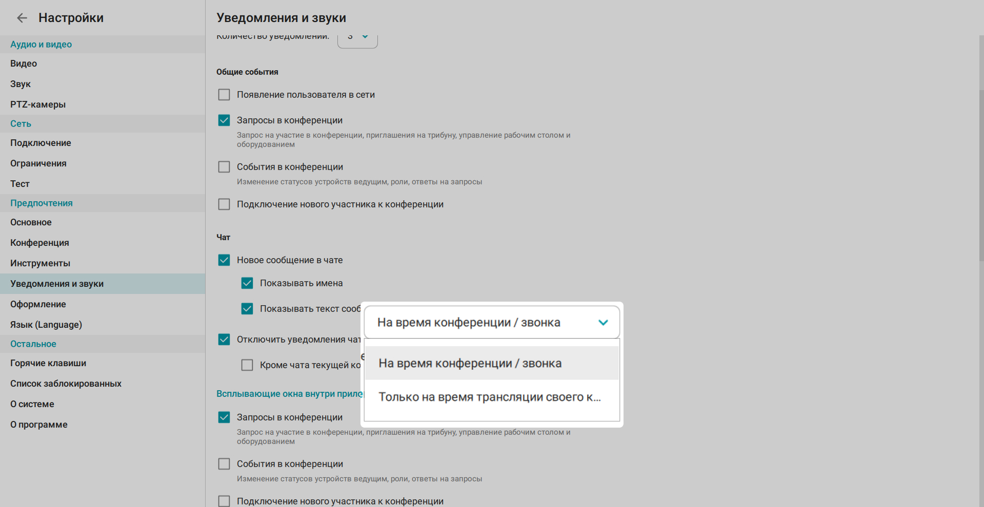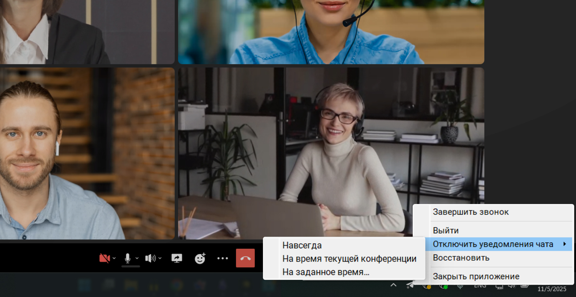 Помимо этого, можно отключить уведомления из всех чатов на время текущей конференции или на заданное время, что поможет лучше сфокусироваться на рабочих задачах и созвонах.