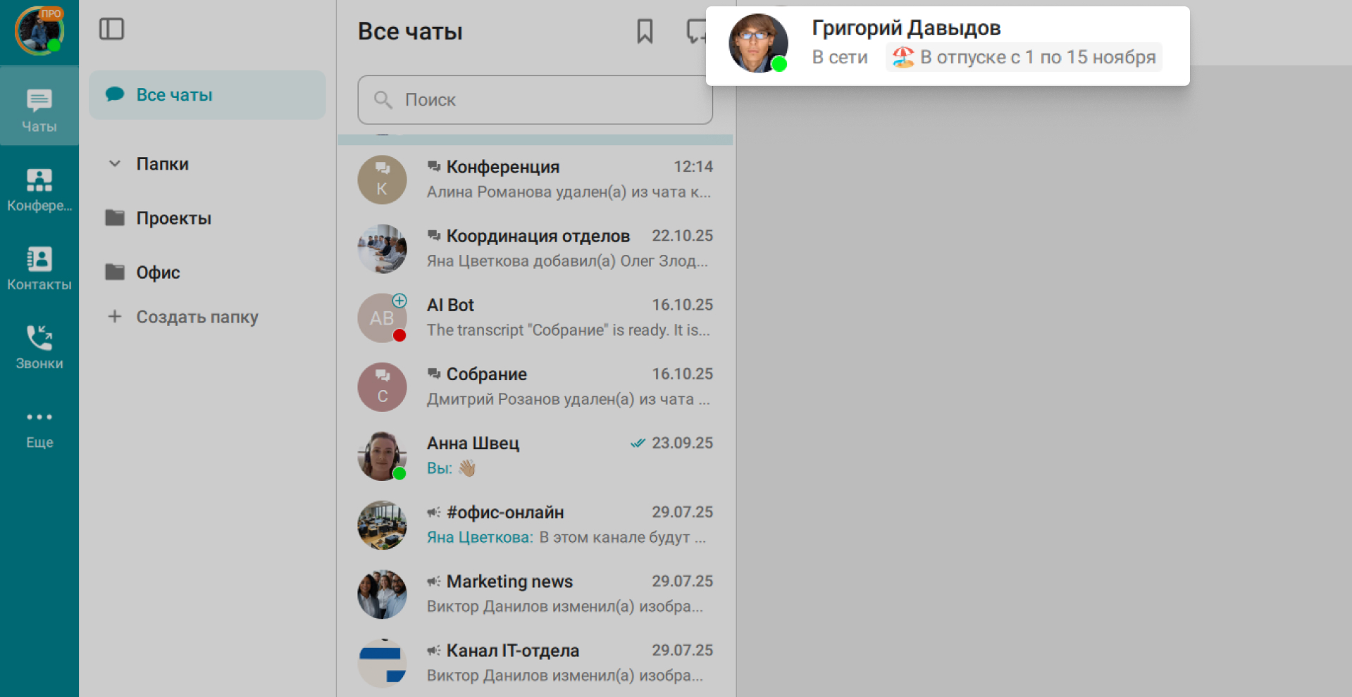 В чате с выбранным пользователем теперь отображается его дополнительный статус – это позволит ориентироваться в графике работы коллег и перенаправлять срочные вопросы коллегам, доступным в данный момент.