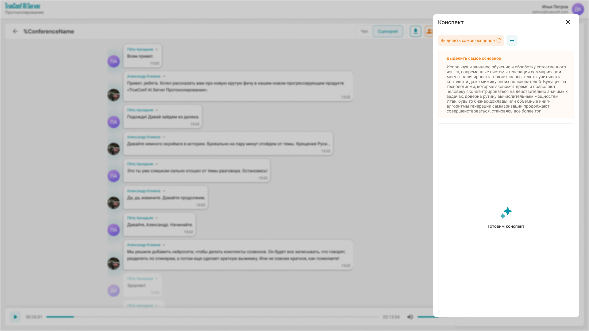 В TrueConf AI Server 1.0.2 мы добавили модуль конспектирования, который анализирует протокол встречи с помощью специальных алгоритмов и делает автоматическую выдержку с информацией об обсуждении, назначенными задачами и будущими встречами.