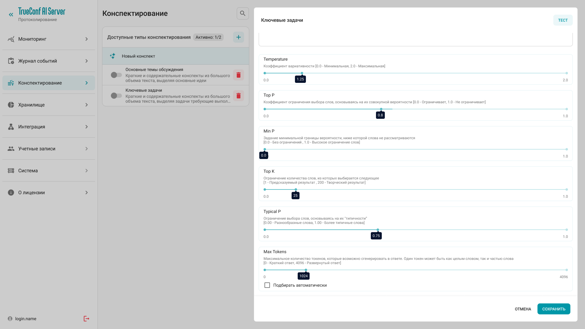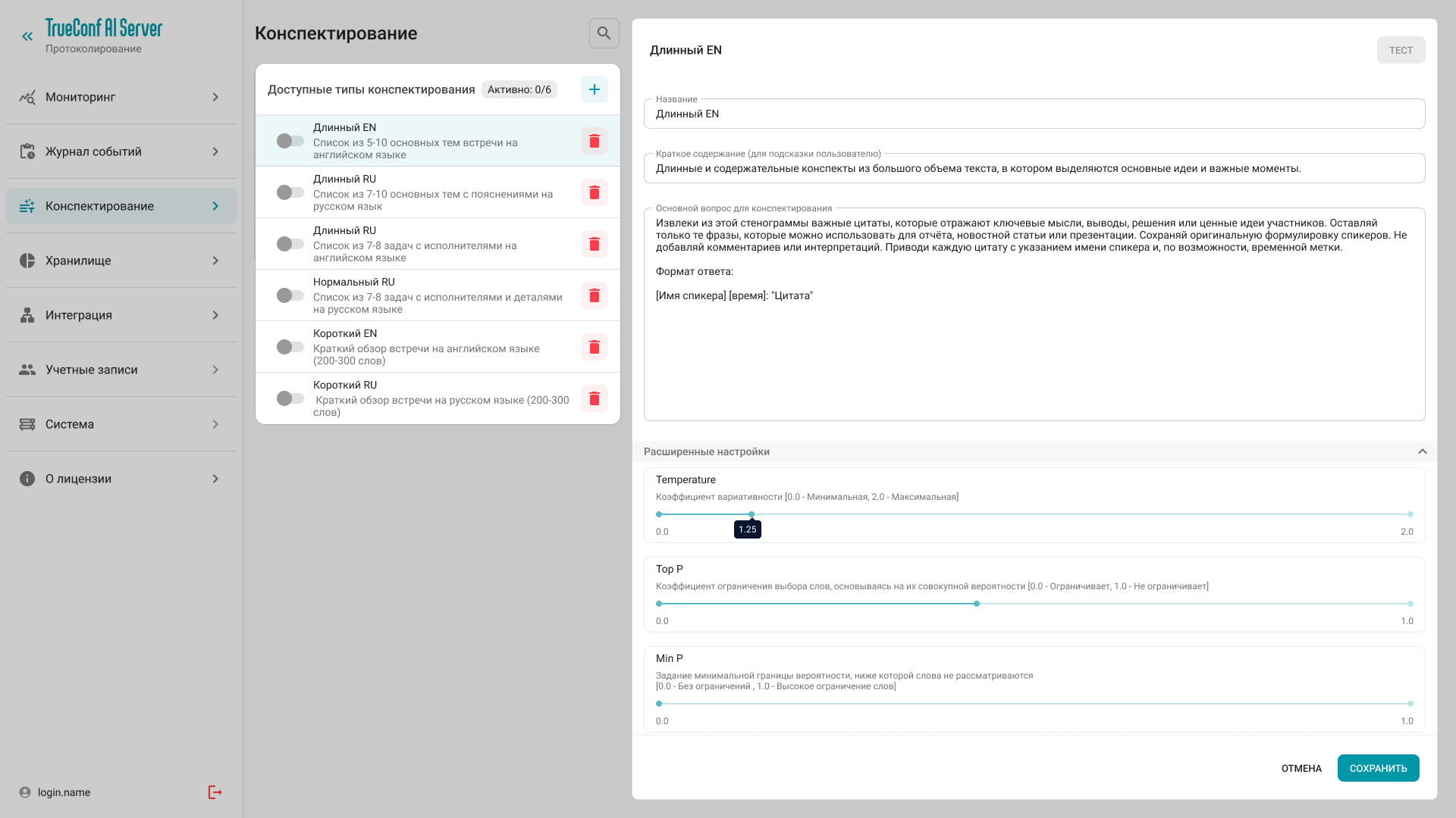 В панели управления TrueConf AI Server администраторы могут активировать доступные промты, добавлять новые или редактировать ранее созданные. Для каждого типа конспекта можно задать название и краткое описание, которое будет отображаться пользователю перед конспектированием, а также сам промт для ИИ, по которому будет формироваться итог встречи.