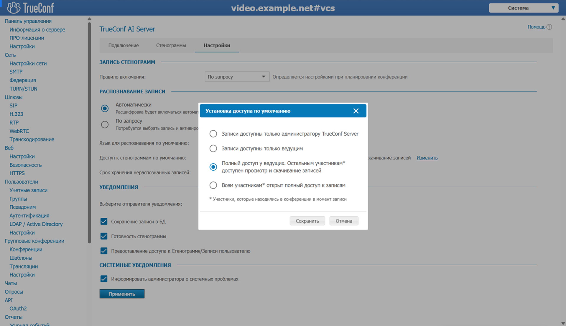 Как это сделать? В панели управления TrueConf Server перейдите в раздел TrueConf AI Server – Настройки и выберите нужный параметр.