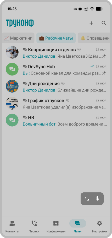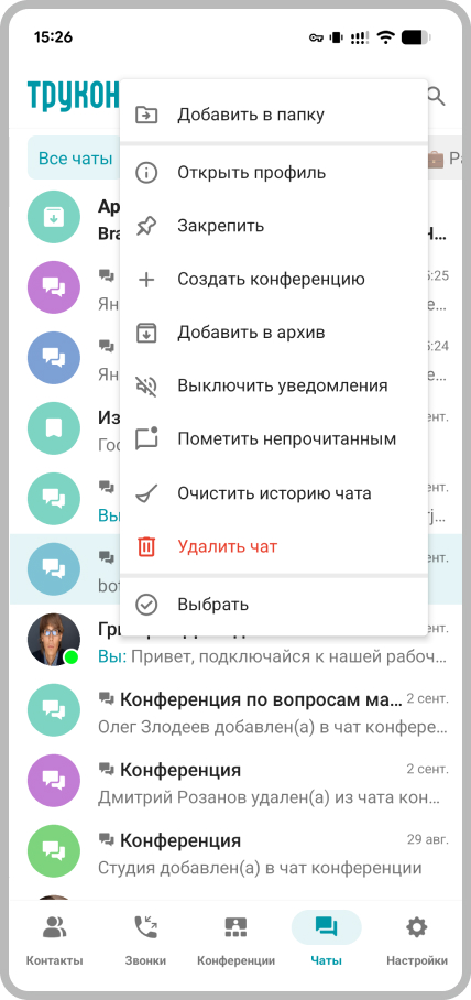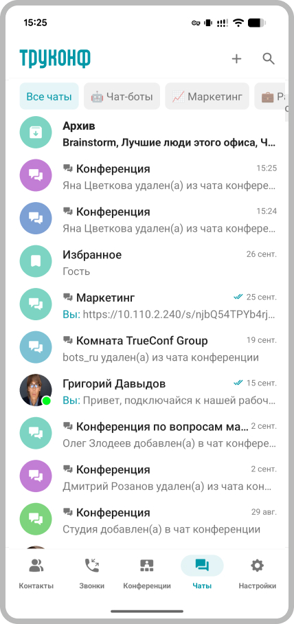 С TrueConf 3.1 для Android общение в корпоративном мессенджере стало значительно комфортнее: распределяйте чаты по папкам, закрепляйте важные беседы и переносите в архив лишнее, а также отмечайте сообщения как непрочитанные, чтобы вернуться к ним позже.