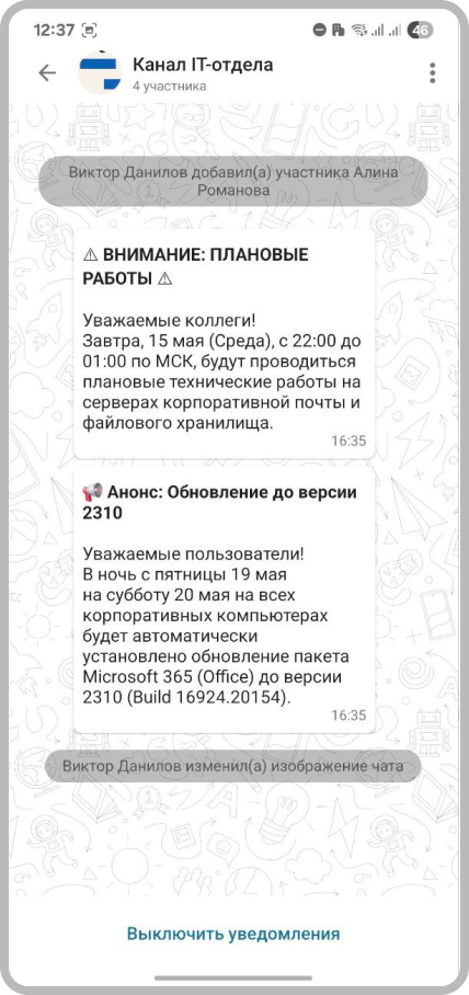 Создавайте каналы, в которые могут писать только владелец и модераторы для организации эффективного оповещения сотрудников и коллег о происходящих в компании событиях.