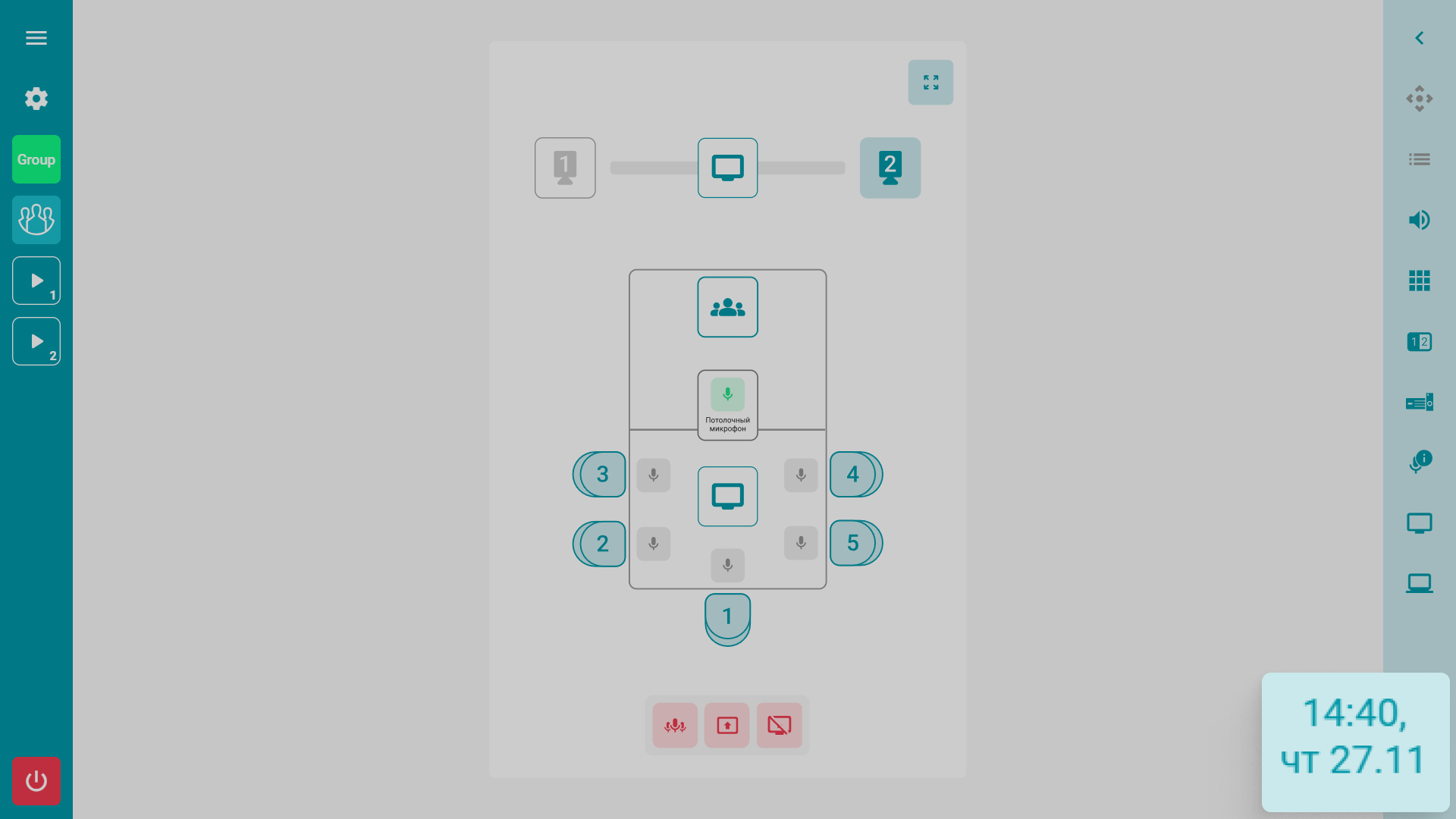 Мы добавили возможность настраивать дополнительные клавиши для прямого взаимодействия с оборудованием. Они позволяют в одно нажатие управлять ТВ-панелями, коммутацией, потолочными микрофонами, положением выдвижных мониторов и другим оборудованием, а также запускать предустановленные сценарии.