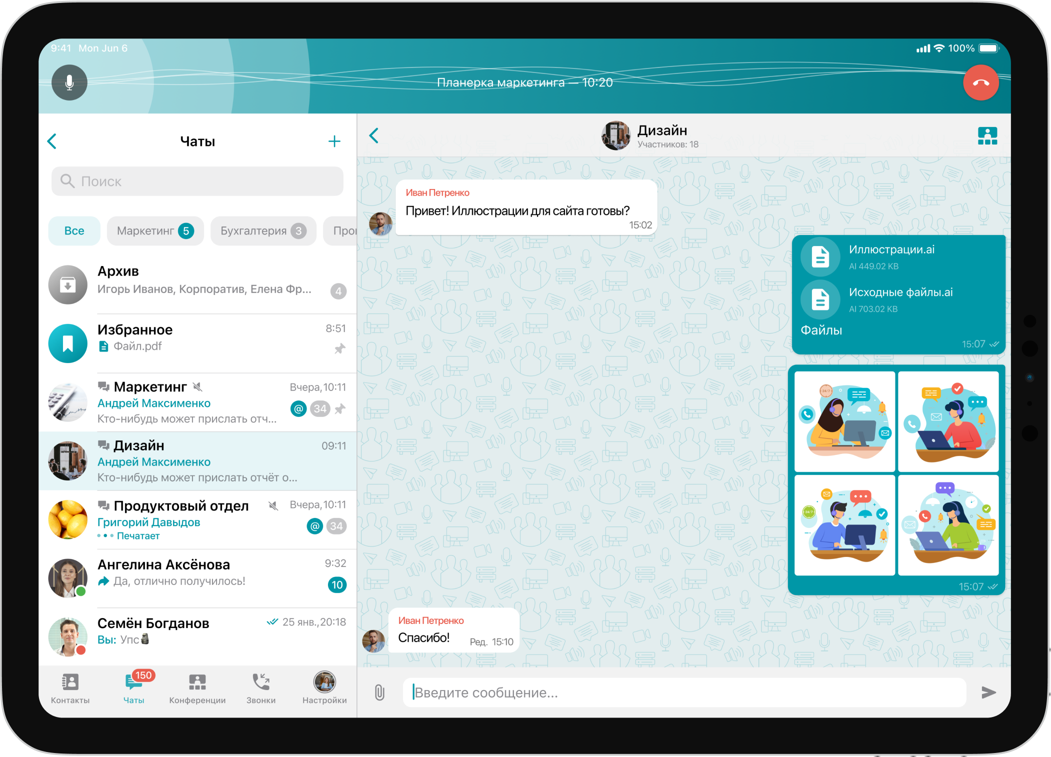 Мы добавили компактную панель текущего вызова, которая появляется во время переписки или работы в других разделах приложения при участии в звонке или конференции. С её помощью можно в любой момент мгновенно вернуться в активную конференцию, а также управлять микрофоном.